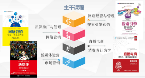 网络营销、直播电商、搜索引擎营销、品牌推广与管理、网络广告新媒体营销、社群营销、管理学、电子商务基础与应用、市场营销、商务谈判、电子商务技能训练、商务数据分析与应用、商品信息采编消费者行为学、经济学基础、电子商务法律法规、经济法、商务礼仪、网店经营与管理、电子商务客户服务等。