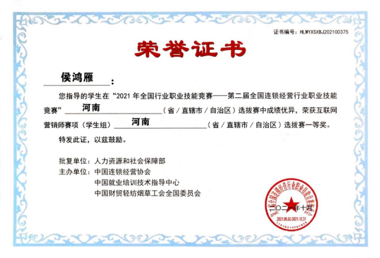 2021年连锁经营管理师省级二等奖1项、三等奖1项