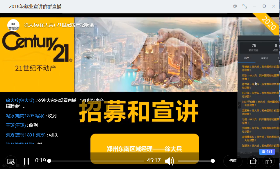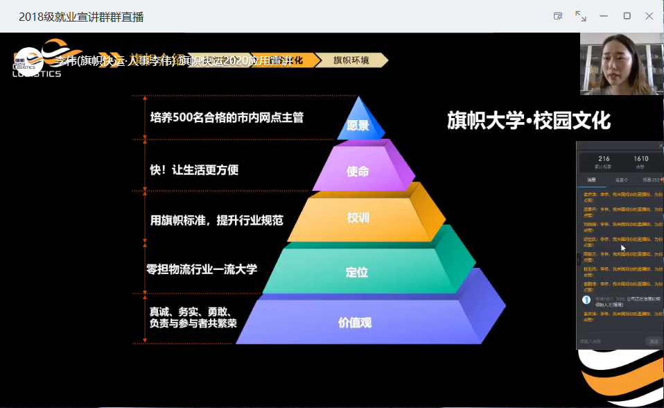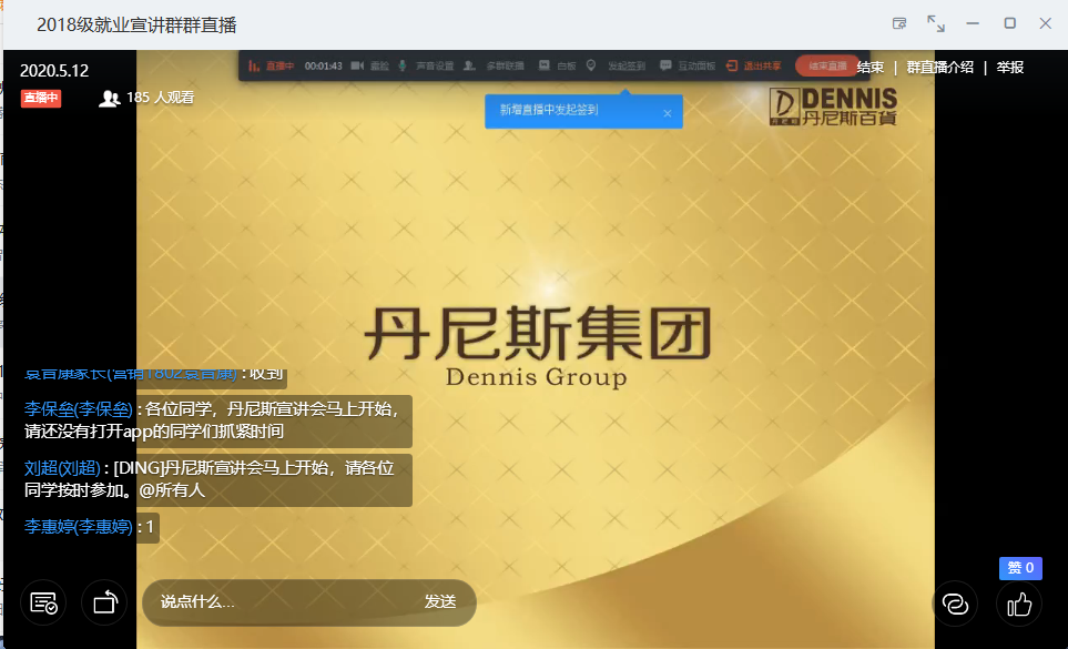 自线上云招聘开启以来,同学们反响热烈,积极参与。3044永利集团多措并举,持续发力,于2020年5月12日下午举行了3场联播云招聘活动。本次招聘由丹尼斯总部人力开发处经理欧阳贞妮、河南旗帜物流有限公司人事经理李伟和21世纪郑州东南片区经理徐大兵为2018级员工做就业宣讲,2018级400余名员工通过钉钉直播参与宣讲会。