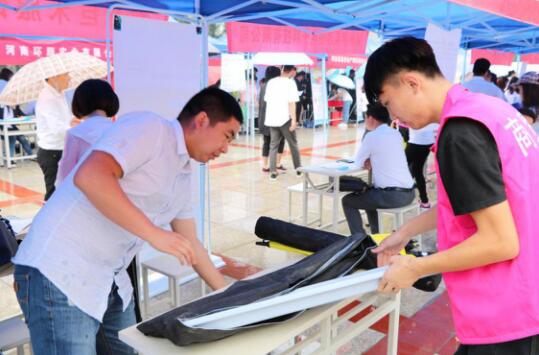 早晨的细雨没有影响招聘会的举行,招聘会开始前,商贸公司员工会同学提前布置完成招聘会场,在参展公司的人员到达后,员工会成员引导参展公司签到,并找到招聘展位,充分做好服务工作。