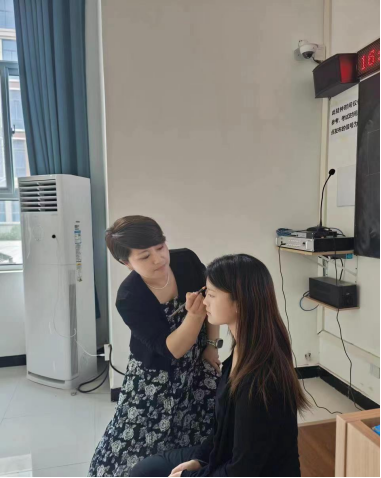 首先,庞轶将妆容理论知识和妆容示范两者结合起来,带领大家一边学习知识一边进行示范。并邀请班级同学作为模特为同学们进行妆容示范。在化妆之前,老师强调妆前要精简护肤,并且告诉大家皮肤保湿的重要性。然后从粉底液的选择、用刷子的手法、眉毛、眼影、睫毛、鼻影、侧影、口红等全方面进行了教学。